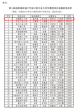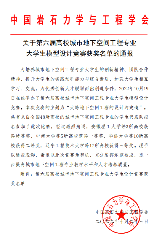 2022年10月19日,由中国岩石力学与工程学会主办,西安理工大学承办的第六届高校城市地下空间工程专业大学生模型设计竞赛在陕西西安举行(线上)。来自西安理工大学、中南大学等48所高校的城市地下空间工程专业的学生代表队参加了此次大赛。经过激烈的角逐,我校土木建筑学院代表队“天穹”(成员:城市地空20-1班,赵玉州;城市地空20-1班,郭贺林;城市地空20-2班,王湘吉;指导教师:姚韦靖)荣获特等奖(第1名)。