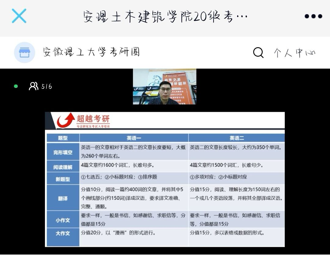 为了加深同学们对考研常识及备考的认识,助力打算考研学生实现高效备考,土木建筑学院于11月15日晚特邀“超越考研”陈亮老师、2021届学长张坤朝线上形式为我院2020级本科生作“2020级考研形势分析与择校复习规划指导”专题讲座。讲座由学院党委副书记张向林主持,学院2020级辅导员以及600余名学生聆听讲座。