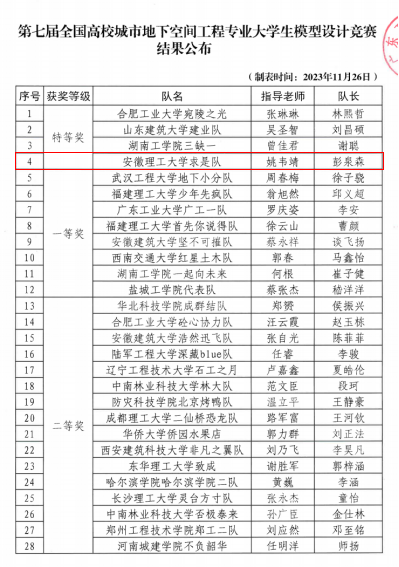 11月24日至26日,由中国岩石力学与工程学会主办、广东工业大学等单位承办的第七届高校城市地下空间工程专业大学生模型设计竞赛在广州举行。经过激烈的角逐,我校土木建筑学院“求是”代表队(成员:城市地空21-2班彭泉森、陈逸楚、周川皓;指导教师:姚韦靖)荣获特等奖。