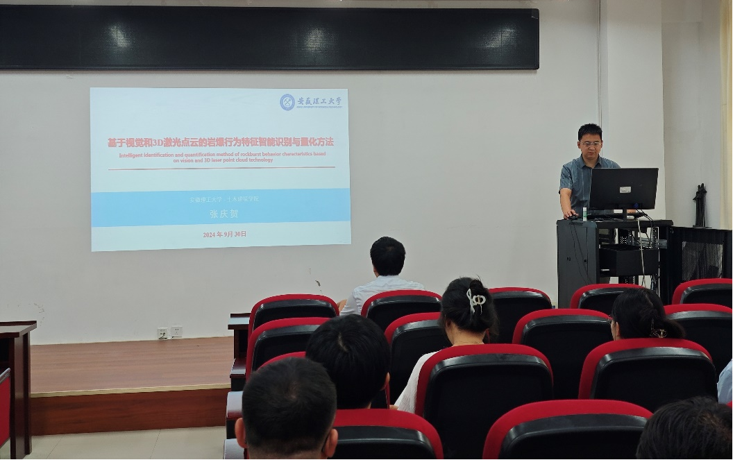 报告会上,张庆贺副教授以《基于视觉和3D激光点云的岩爆行为特征智能识别与量化方法》为题,针对岩爆事件的记录难题,开发了一种安全智能的识别技术和仪器。基于机器视觉和3D激光点云技术,融合相应的处理算法,实现了岩爆发生时间、落石位置、落石速度和落石大小等信息的自动测量。详细汇报了仪器设备集成方案、算法开发原理、从数据采集到数据分析的工作流程。研究成果相较于传统的人工勘察方法具有更高的效率,并保障了检测人员安全。为岩爆事件的智能监测和行为特征研究提供了新方法和新思路。