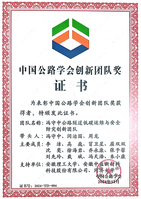 2024年12月9日,中国公路学会科技奖励大会在深圳召开,我校特聘教授冯守中作为团队领军人,获得2024年度中国公路学会首届创新团队奖,2024年度中国公路学会科学技术奖共评选出五个创新团队奖,获奖团队中唯一以名字命名的是我校为主要支持单位的“冯守中公路隧道低碳运维与安全防灾创新团队”。