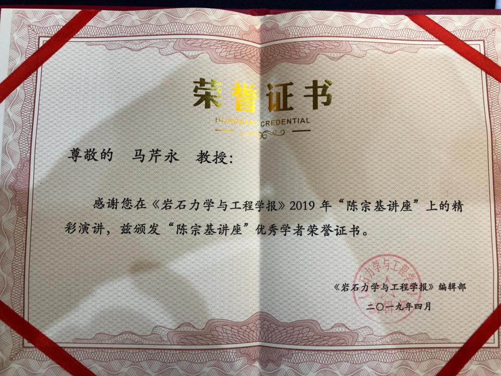 论坛中,2019年“陈宗基讲座”由冯夏庭教授主讲,他以《岩爆孕育过程研究》为题作了报告。挪威科技大学李春林教授、加拿大劳伦森大学蔡明教授分别作大会主题报告。马芹永教授、平琦副教授分别作了题为《冻结裂隙粘土动态力学特性试验与破坏机理分析》和《冲击载荷作用下高温砂岩动态力学性能试验研究》的学术报告,受到与会专家关注。马芹永教授因作精彩报告,被评为2019年“陈宗基讲座”优秀学者。