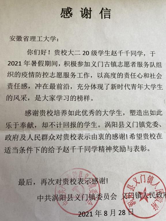 信中写到:“赵千千同学于2021年暑假期间,积极参加义门古镇志愿者服务队组织的疫情防控志愿服务工作,以高度的责任心和社会责任感冲锋在最前沿,充分体体现了新时代青年大学生的风采,是大家学习的榜样。感谢贵校培养如此优秀的大学生,塑造出如此乐于奉献,却不计回报的学生。”