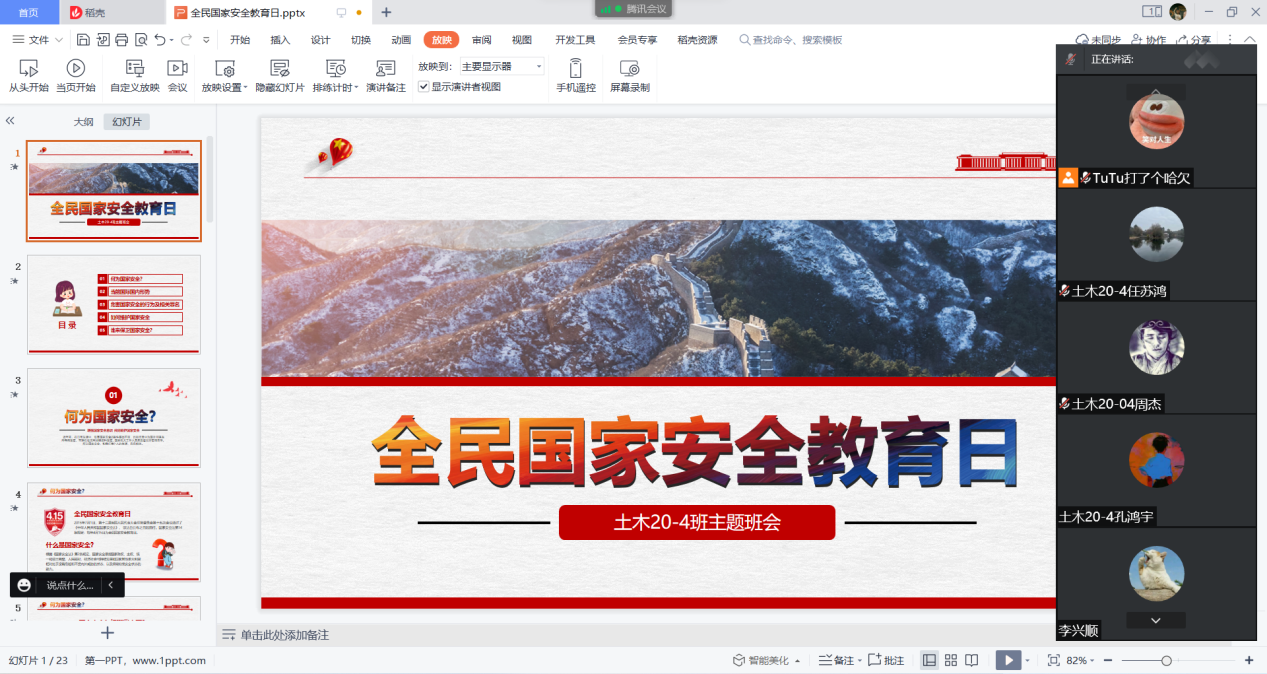 主题班会,宣传到位。在当前疫情防控要求下,土木建筑学院各班级在腾讯会议、腾讯课堂等平台开展以“全民国家安全教育”为主题的线上主题班会,班会上主要从国家安全观向大家强调了国家安全的重要性,倡导大家知法、守法,提及到政治、军事、国土、经济、文化、社会、科技、网络、生态、资源、核、海外利益、太空、深海、极地和生物共十六方面,介绍了国家各方面的安全,使同学们牢固树立了国家安全观念。