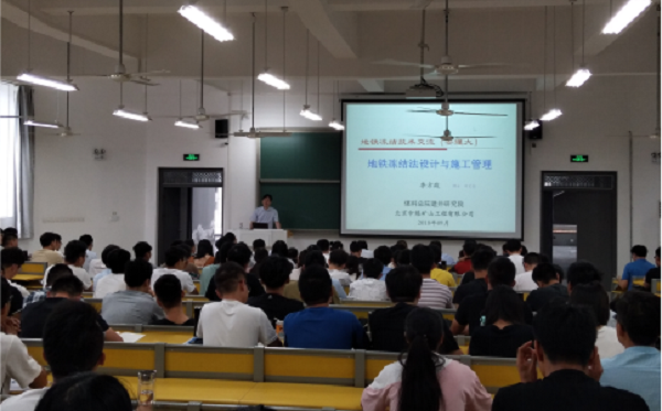 李方政以《地铁冻结法设计与施工管理》为题,首先回顾了冻结法的发展历程以及在矿山建设和地铁加固中的工程应用情况;分析了冻结法的适用条件和冻结过程中冻土的温度场变化及力学特性,重点列举了冻结法的应用案例。介绍了冻结法设计过程中冻结参数的选取原则和施工关键技术,强调针对城市地下空间开发过程中一定要考虑地下水对冻结效果的影响。最后,针对冻结过程中易出现的风险和灾害如冻胀、融沉、冻结管偏斜等的预防和控制方法进行了介绍。整场报告理论水平高、工程案例丰富、图文并茂,内容翔实,加深了师生对地铁冻结法设计的全面认识,为学生进一步开展学位论文研究提供了方法。