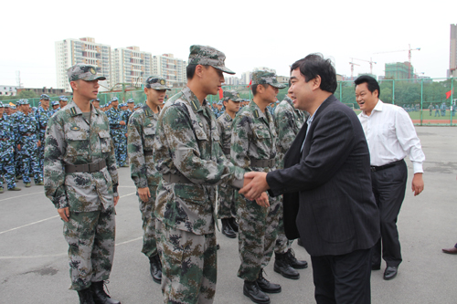 学院党政领导观看了新生的训练情况,对新生严肃认真的训练态度、刻苦的训练精神表示高度赞赏。院党委书记盛真代表学院领导班子向学员们和承训的教官们表示亲切的慰问,他肯定了参训学员们表现出的认真刻苦的优秀品质,勉励参训学员们继续发扬不怕苦、不怕累的牺牲精神,用更加饱满的热情、顽强的意志,刻苦训练,圆满完成军训任务。