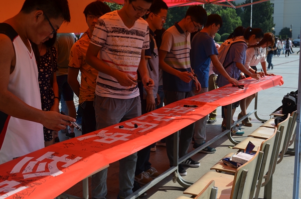 在北校区喷泉广场,土木建筑学院大二学生举行了大型纪念9.18展板活动和签名活动。展板以图片的形式展出了那段可歌可泣、艰苦卓绝、荡气回肠的民族抗战史。几十年前的烽火硝烟已经散去,那些或策马啸西风的豪放,或引刀成一快的悲壮都已经化为一缕缕历史的记忆。这些记忆弥足珍贵,他们不但镌刻着中华民族在最危险时刻中迸发出的壮丽色彩,也将激励着现代中国人不断进取的步伐。签名活动中,同学们在10米长的横幅上庄严的签上了自己的姓名,每一个姓名不仅仅有学生对祖国的美好祝愿,更有他们“好好学习,报效祖国的铮铮誓言!