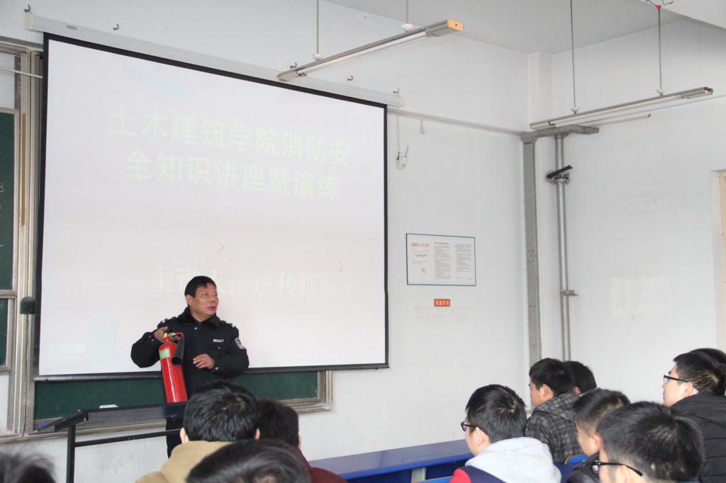 为贯彻落实学校冬季安全月活动文件通知精神,普及消防安全知识,增强学生消防安全意识,11月28日上午,土木建筑学院邀请校保卫处消防科卢传江老师在校本部新附2205教室做了一场消防安全知识讲座暨演练活动,讲座由学院副院长吴秉江主持,2015级全体研究生参加了活动。