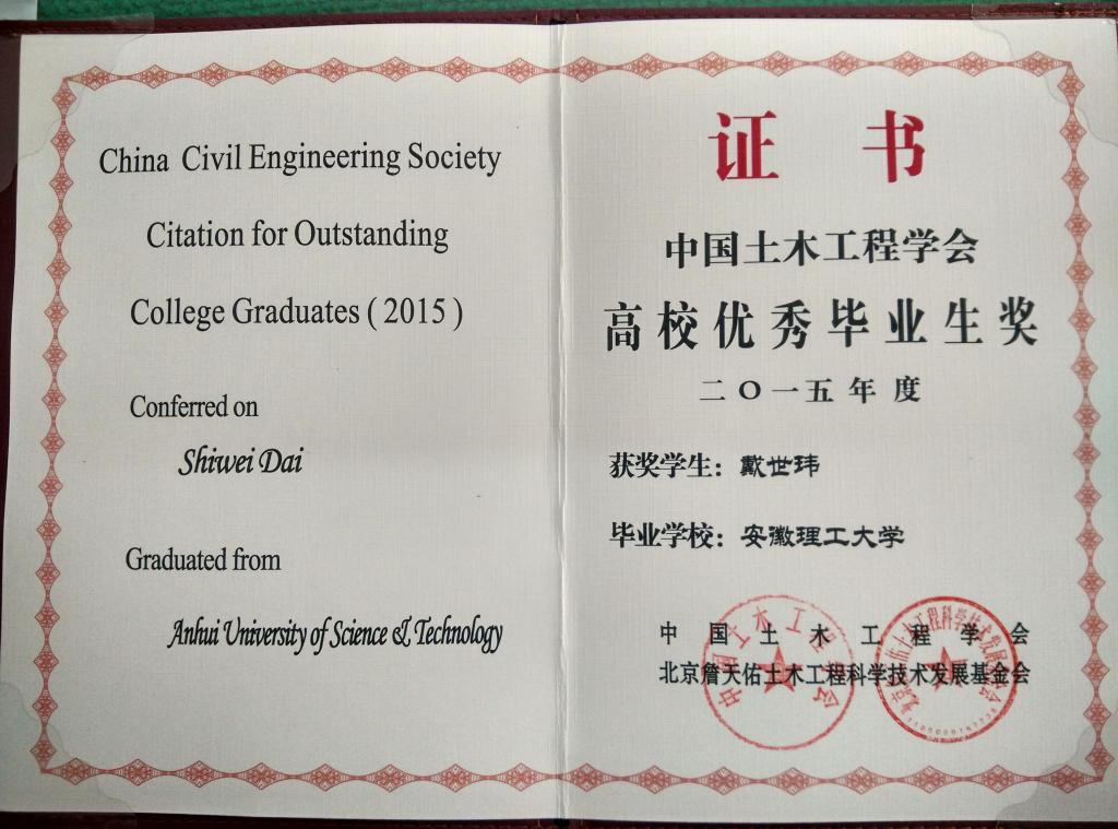 近日,从中国土木工程学会传来喜讯,我校土木建筑学院2015届毕业生戴世玮荣获“中国土木工程学会优秀毕业生奖”,并获得由中国土木工程学会和詹天佑土木工程基金会颁发的证书和奖金。