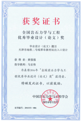 12月12日,中国岩石力学与工程学会公布了“2016年全国岩石力学与工程优秀毕业设计(论文)奖”获奖名单,由土木建筑学院马宏伟老师指导,城市地下空间工程专业2016届毕业生黄强强完成的本科毕业设计《天津市地铁二号线翠阜新村站出入口设计》名列其中。全国共有30篇城市地下空间工程、土木工程、矿业工程、安全科学与工程等学科的本科毕业设计(论文)获此殊荣。
