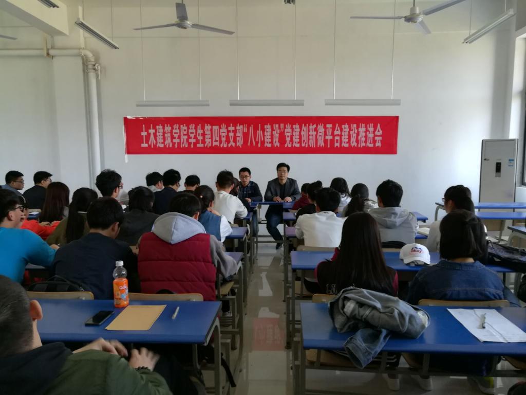 为积极探索新形势下高校学生党建创新工作的新思路、新途径和新方法,努力实践形成有特色、有影响的党建工作特色品牌,进一步深化学习型、服务型、创新型学生党组织建设成果,不断提高学生党组织凝聚力、战斗力和创造力。4月13日,土木建筑学院学生第四党支部在求是楼南110室召开“八小建设”党建创新微平台建设推进会。学院党委副书记丁志强、支部全体党员、入党积极分子、“八小建设”党建创新微平台建设小组全体成员等40余人参加了会议。推进会由学生第四党支部书记任少伟主持。