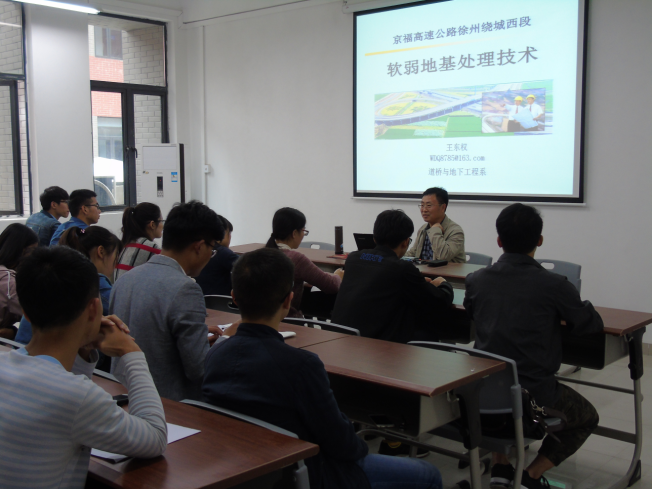 王东权以“软弱地基处理技术”为题,结合京福高速公路重大工程,分析了穿过不良软弱地基地基具有的厚度大、分布广、承载能力低和沉降量大特点,利用搅拌桩法和干振挤密碎石桩法对该类型的地基进行处理,效果良好。对同步爆扩法处理高速公路液化土地基的方案和效果进行了介绍。整个报告会工程案例典型,内容充实,做到了理论和实践的紧密结合,令在场师生对高速公路软弱地基处理技术有了进一步的认识。