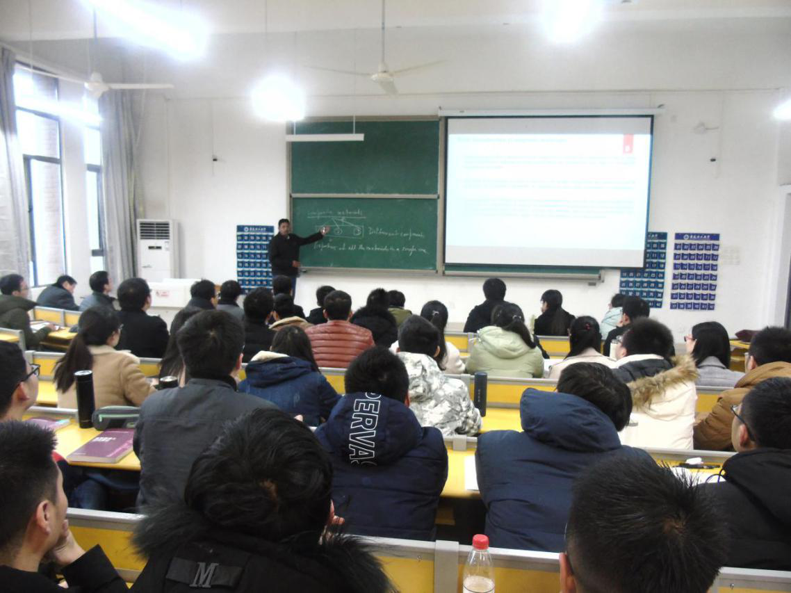 Halder博士以《Manufacturing of advanced composite materials》为题,从复合材料广阔的应用范围出发,以复合材料与普通材料的对比作为切入点,深入分析了复合材料的优势和不足,以及复合材料的各项组分,介绍了表面和相变材料的区别及其分类等。整场报告用英文进行,板书与PPT相结合,内容丰富,使听众对复合材料有了进一步的了解和认识,为研究生进一步开展学位论文研究提供了思路。报告会后,Halder博士还与现场师生进行了互动。