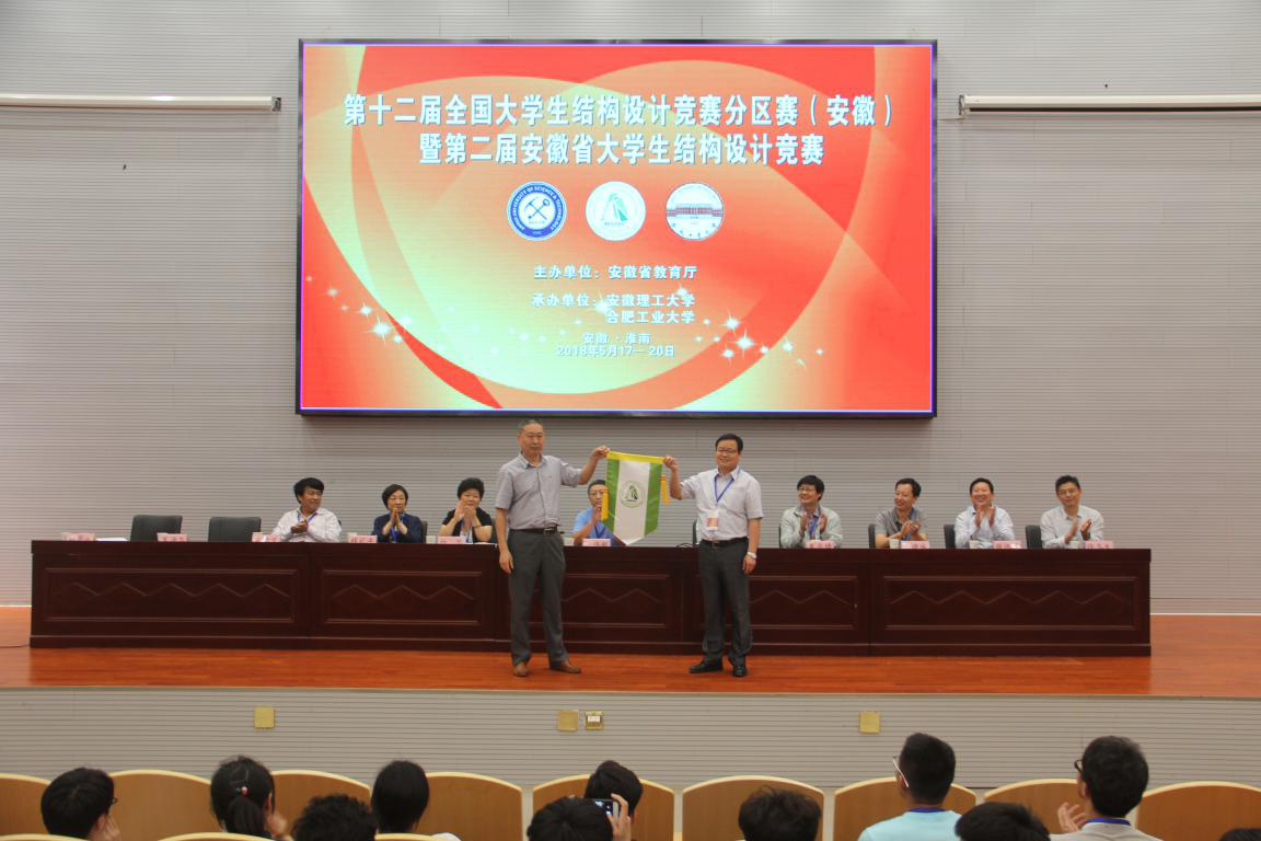 第二届安徽省大学生结构设计竞赛专家委员会主任委员、合肥工业大学土木与水利工程学院院长任伟新教授宣布第三届安徽省大学生结构设计竞赛将由皖西学院承办,我校土木建筑学院院长马芹永教授与皖西学院建筑与土木工程学院院长戈海玉教授进行了赛旗交接仪式。