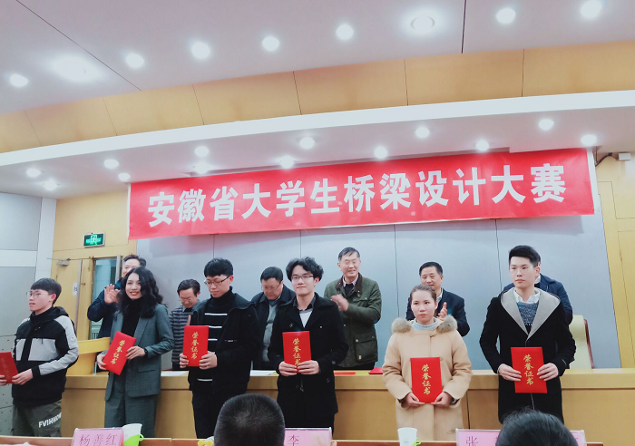 12月8日,由安徽省公路学会主办,合肥工业大学承办的“设计总院杯”首届安徽省大学生桥梁设计大赛于在合肥工业大学举行,来自全省开设桥梁专业高校的35支队伍参加了多个奖项的角逐。由土木建筑学院李海涛、乔成老师指导,陈富琨、王生志、杨阳、郭安康、卫秀文5位同学组成的队伍,以参赛作品《鹓鸿》荣获设计类二等奖;杜伟杰、李晓辉、贾靖凡、余长龙、王杰5位同学组成的队伍,以参赛作品《蝶式腹板跨淮河斜拉桥》荣获设计类三等奖;由力学与光电物理学院张宏学老师指导,木志远、曹云强、杨子航、姚国锋4位同学组成的队伍,以参赛作品《逐梦》荣获科技创新、创意类二等奖;为学校争得了荣誉。