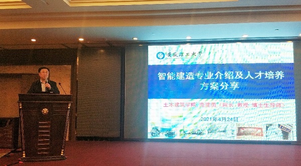 土木建筑学院党委副书记、执行院长庞建勇带队参会,并作题为《智能建造专业申报、建设及人才培养方案分享》主题报告,介绍了我校智能建造专业申报的前期工作基础、学校发展平台和专业建设方向,受到了参会单位代表的热切关注。