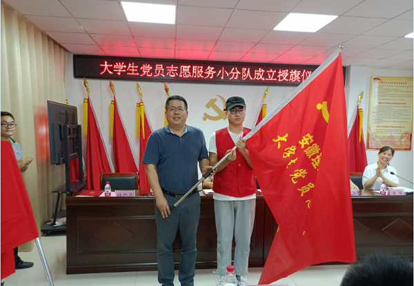 土木建筑学院党委副书记赵军宣读了《关于成立大学生党员志愿服务小分队的决定》,并为大学生党员志愿服务小分队授旗。