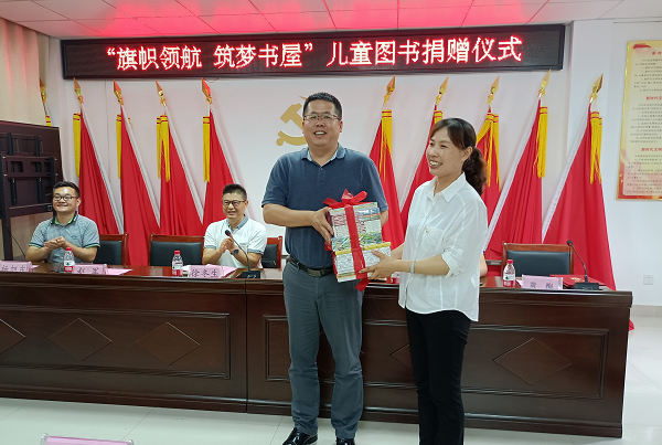 土木建筑学院党委副书记赵军向“旗帜领航 筑梦书屋”主题党日学习示范点(校村共建儿童书屋)捐赠图书。