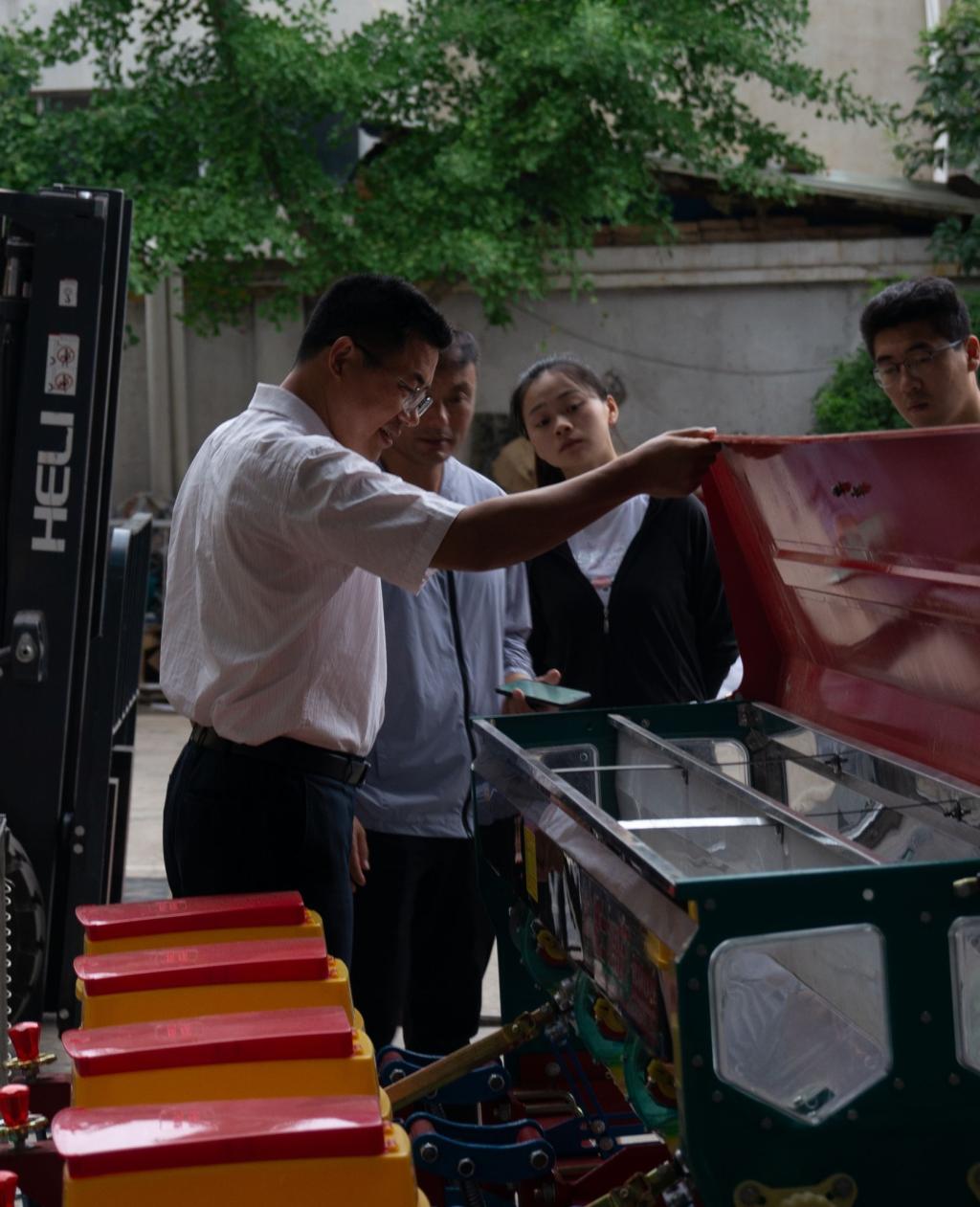 仪式结束后,丁经理带领社会实践团队志愿者走进车间,参观了企业最新自主研发的防缠绕高茬宽幅播种机、自走式打药机等核心产品的全自动生产线和研发实验室。