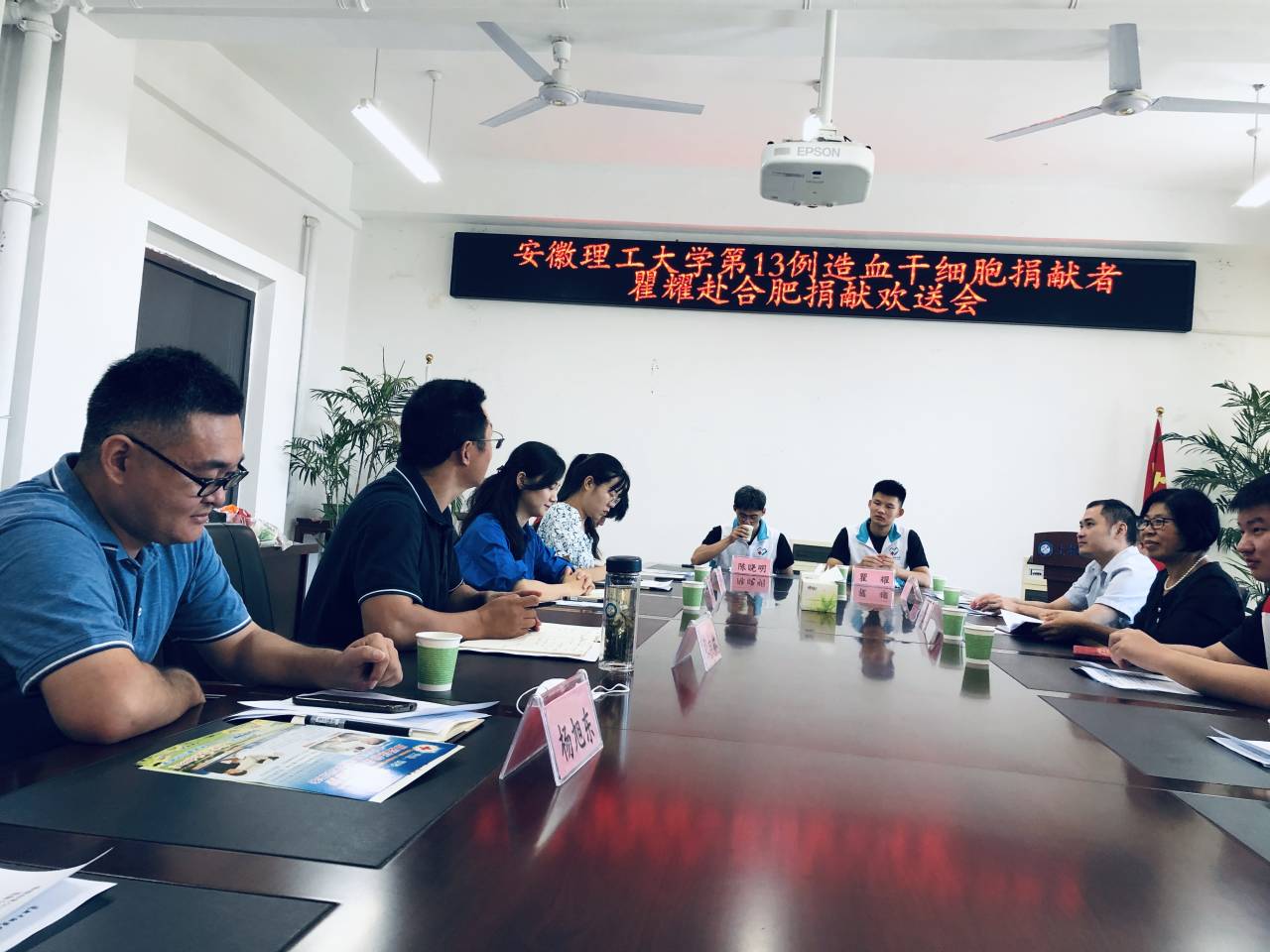 淮南市红十字会联合安徽理工大学在求是楼南231会议室举行造血干细胞捐献者瞿耀同学赴合肥捐献欢送仪式。淮南市红十字会常务副会长兼秘书长陈玉琴、校团委副书记丁玲玲、土木建筑学院党委副书记张向林、教师代表、淮南市造血干细胞已捐献者代表及志愿者代表、国寿财险公司负责人出席欢送仪式。