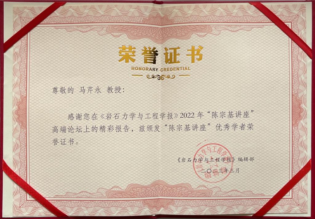 马芹永教授在大会上作了题为《煤矿深部砂岩力学性能试验与本构关系》的学术报告,受到与会专家关注,并被评为2022年“陈宗基讲座”优秀学者。