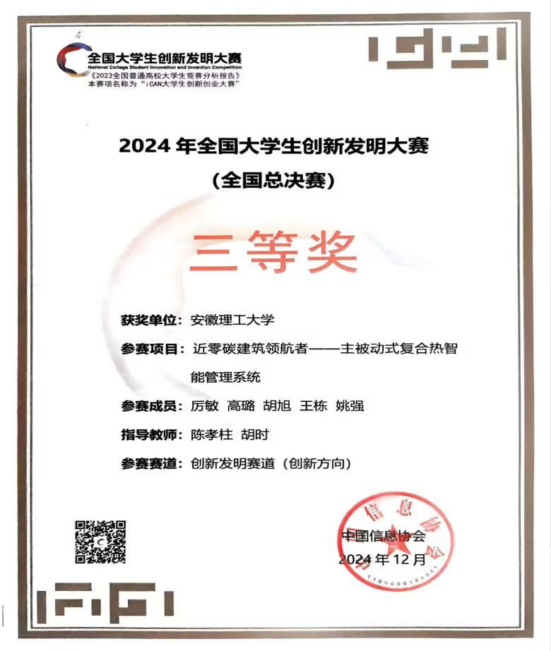 近日,为期三天的全国大学生创新发明大赛全国总决赛于江苏南京举行。全国1120多所学校,200余万名在校大学生报名参与了校、区域、全国三级赛事的比赛。他们在创新发明、创业两大赛道展开激烈的比拼,最终589支团队脱颖而出。我校学子厉敏、高璐、胡旭、王栋、姚强(指导教师:陈孝柱、胡时)的参赛项目《近零碳建筑领航者——主被动式复合热智能管理系统》获创新发明赛道(创新方向)三等奖。
