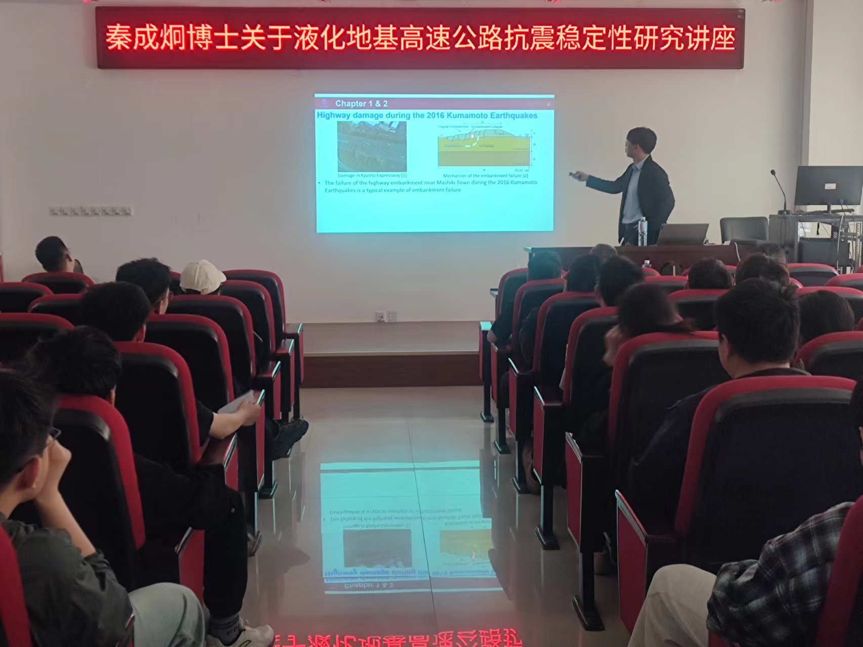 会后,秦成炯在求是楼227报告厅作题为《Hybrid Type Reinforcement towards Enhancing Seismic Stability of Highway Embankment Resting on Liquefiable Ground》的学术报告。张庆贺主持报告会。