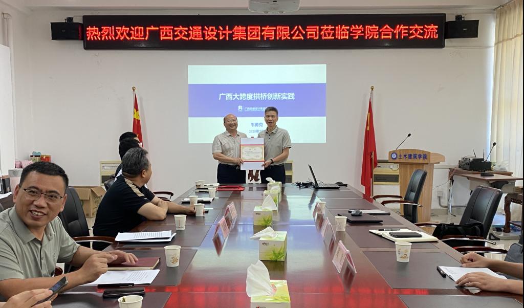 荣传新对韦勇克一行来院指导交流表示欢迎,并聘请韦勇克正高工担任我校特聘教授,并颁发聘书。荣传新介绍了学院的办学历史、学科特色、人才培养及近年来在科研工作方面取得的成果。韦勇克对学院的热情接待表示感谢,介绍了广西交通设计集团有限公司的基本情况,希望以此次交流为契机,为校企科研合作搭建良好的沟通桥梁,共享资源、共谋发展。