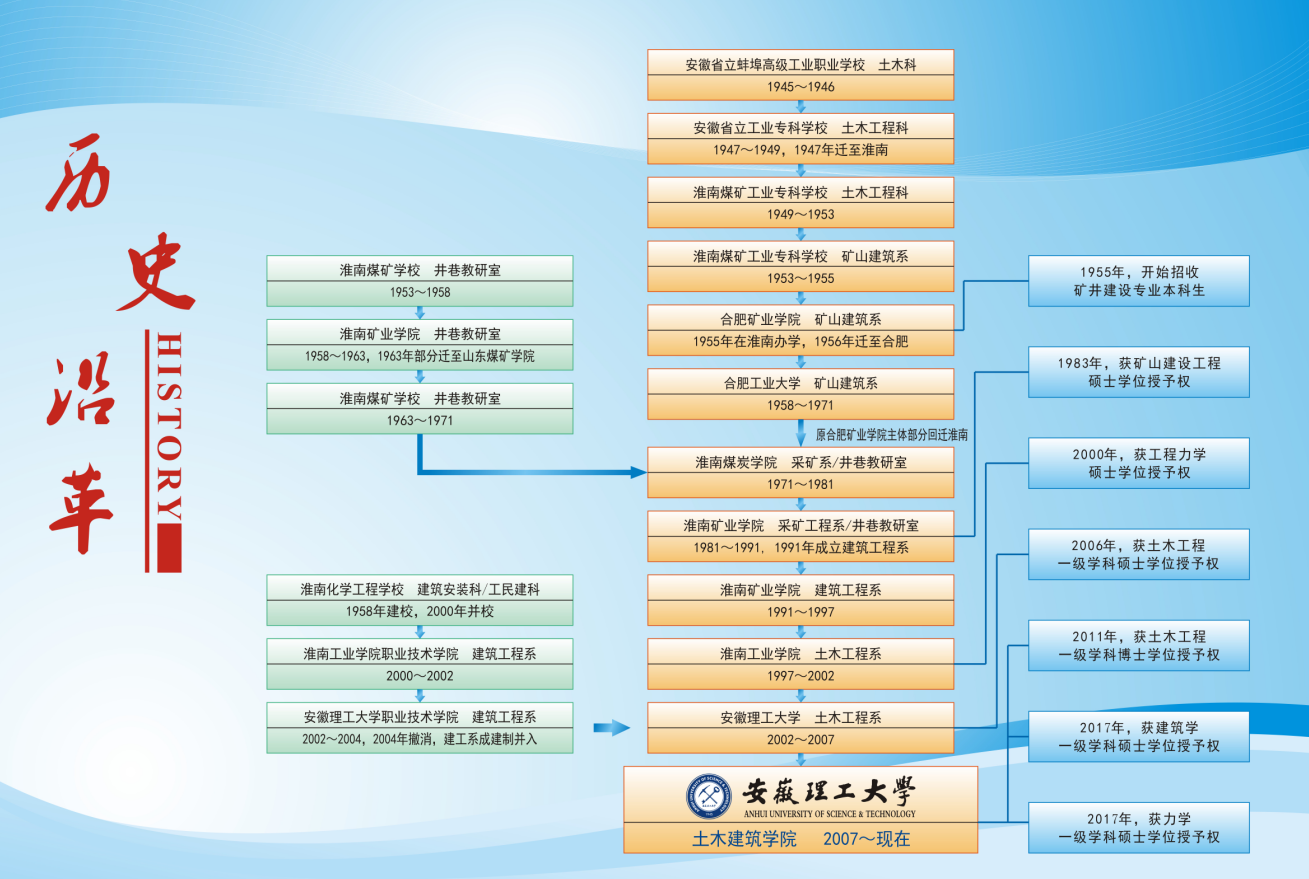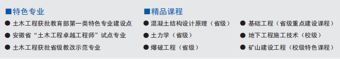土木建筑学院具有悠久的办学历史,始于1945年安徽省立蚌埠高级工业职业学校创办的土木科,是学校创办初期的三个专业之一;经过70多年的建设发展,已成为教学质量高、办学特色鲜明的学院之一。学院拥有土木工程博士后科研流动站,土木工程一级学科博士、硕士授予权,建筑学、力学一级学科硕士学位授权点,土木工程学科是学校重点建设的三个一流学科之一。土木工程专业为“教育部第一类特色专业”;建筑学为教育部—欧特克专业综合改革试点专业;岩土工程和结构工程为安徽省重点学科。