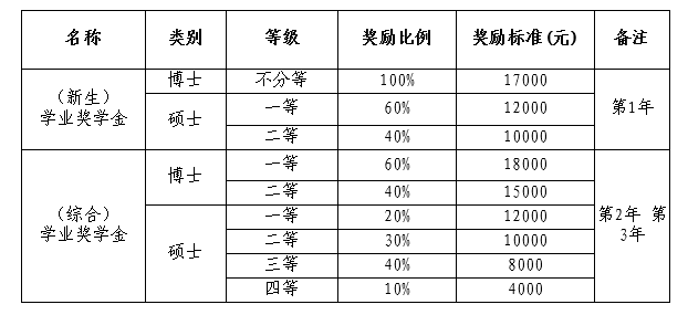 三年级的硕士研究生和博士研究生,学业奖学金主要依据学习成绩(占20%)、科研成果计分(占80%),如得分相同,则思想品德、社会服务等方面表现突出者优先。