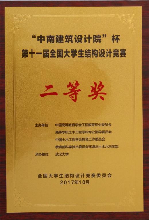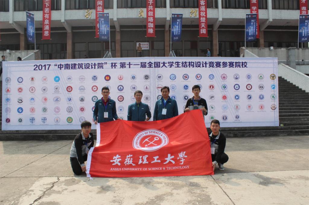 2017年10月19日至22日,由高等学校土木工程学科专业指导委员会、中国土木工程学会教育工作委员会联合主办的“第十一届全国大学生结构设计竞赛”在武汉大学举行。来自清华大学、上海交通大学、同济大学、澳门大学等全国107所高校的108支参赛队伍参加了本次竞赛。安徽理工大学土木建筑学院代表队参赛并荣获全国二等奖。