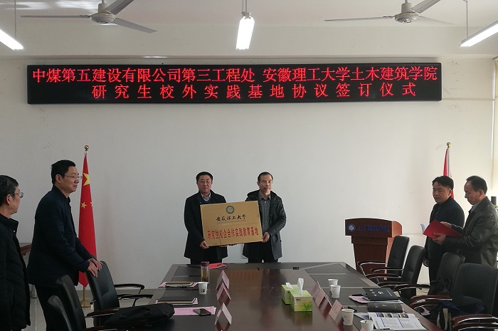 仪式上,庞建勇教授代表学院对中煤第五建设有限公司一行表示热烈欢迎,并简要介绍了学院发展历程,以及近年来科学研究、学科建设和人才培养方面所取得成绩。希望能与中煤第五建设有限公司全面加强合作、实现双赢。学院博士生导师、地下工程结构研究所所长程桦教授详细介绍了我院在地下结构工程领域所取得的关键技术标志性成果和成功典型案例,并期望与中煤第五建设有限公司加强科研合作,提高技术自主创新水平。袁兆宽总工程师介绍了中煤第五建设有限公司的基本情况和在矿井建设中存在的技术难题,希望能与学院加强合作,充分发挥中煤五建三处的施工技术优势和学院科研、人才等资源优势,本着“优势互补、互利互惠、双向促进、共同发展”的原则,建立长期稳定的战略合作伙伴关系。