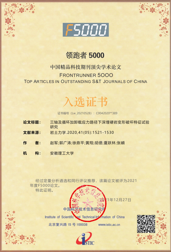 近日,我校土木建筑学院赵军副教授的一篇题为“三轴及循环加卸载应力路径下深埋硬岩变形破坏特征试验研究”的论文入选2020年度中国精品科技期刊顶尖学术论文,即F5000(领跑者5000)。