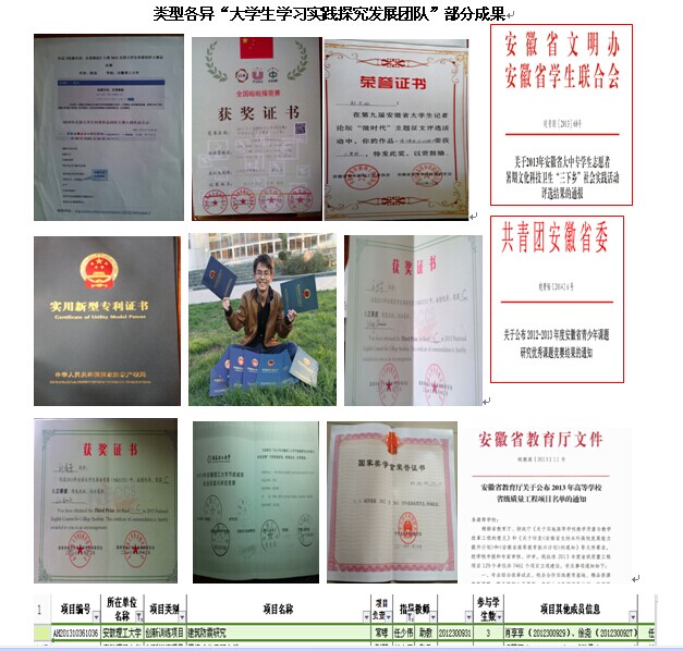 自“探究型学习发展团队”成立两年多来,取得了不错成绩。2012年11月-2014年10月,学生荣获国家级、省级、校院级科技与学科相关竞赛奖项78项。其中,1人获“中国大学生自强之星”,获全国大学生科普创新作品大赛入围奖2项(入全国20强),10人分别获第七届“认证杯”数学中国数学建模网络挑战赛全国比赛第一阶段、第二阶段二、三等奖,2人“2014高教社杯”全国大学生数学建模竞赛安徽赛区三等奖、1人获第五届全国大学生数学竞赛省级二等奖;获批省级大学生创新创业训练计划项目10项,申报安徽省双百科普大赛作品19件,2013年申报校大学生科研项目8项,获批1项,2014年获批校大学生科研项目3项,1人获“”团中央学习团的十七大精神微博大赛全国一等奖,1人被校推荐“全国少数民族优秀大学生”候选人,1人获安徽省百所高校百万大学生科普创新创意优秀志愿者,1人获全国大学生数学竞赛安徽赛区二等奖,3人获全国大学生英语竞赛三等奖;1人荣获校第六届“挑战杯” 大学生创业计划竞赛铜奖,1人获第四届江南化工杯校创业计划大赛铜奖、1人获校第一届生态文明创意设计大赛“创意设计类”作品一等奖,1人获校节能减排社会实践与科技竞赛优秀奖;1人分别获2013年全国啦啦操联赛街舞第八名、全国啦啦操联赛总决赛花舞第三名;1人获安徽省大学生记者论坛征文比赛三等奖。