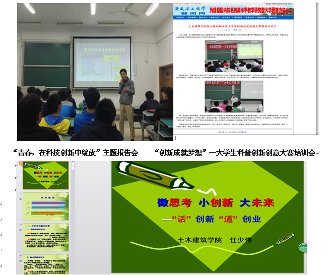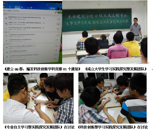 土木建筑学院历来高度重视学生创新工作,积极营造学生科技创新良好氛围。2012年10月,2012级土木工程专业10个班中,遴选具有创新创业精神具备科技创新、学科竞赛,文体等方面潜力的学生,组建4支“探究型学习发展团队”。针对高等数学、大学英语、理论力学等专业核心课程成绩优异学生成立“专业自主学习型实践探究发展团队”,主要参加全国大学生数学建模竞赛和全国周培源大学生力学竞赛等赛事;针对具有较强科技创新潜能的学生成立“科技创新型学习实践探究发展团队”,主要参加全国大学生“挑战杯”大赛和全国大学生节能减排与实践大赛、全国大学生创新创业训练计划项目等赛事;针对具有“商业头脑”,喜欢做“小生意”学生成立“自主创业型学习实践探究发展团队”,主要参加全国大学生创业计划大赛、全国大学生电子商务“创新创意创业” 挑战赛、全国管理决策模拟大赛等赛事;针对文体方面有特长和潜质的学生成立“文体竞技学习实践探究发展团队”。