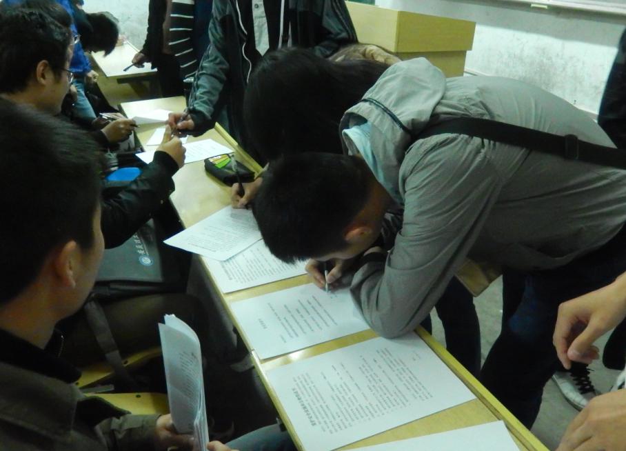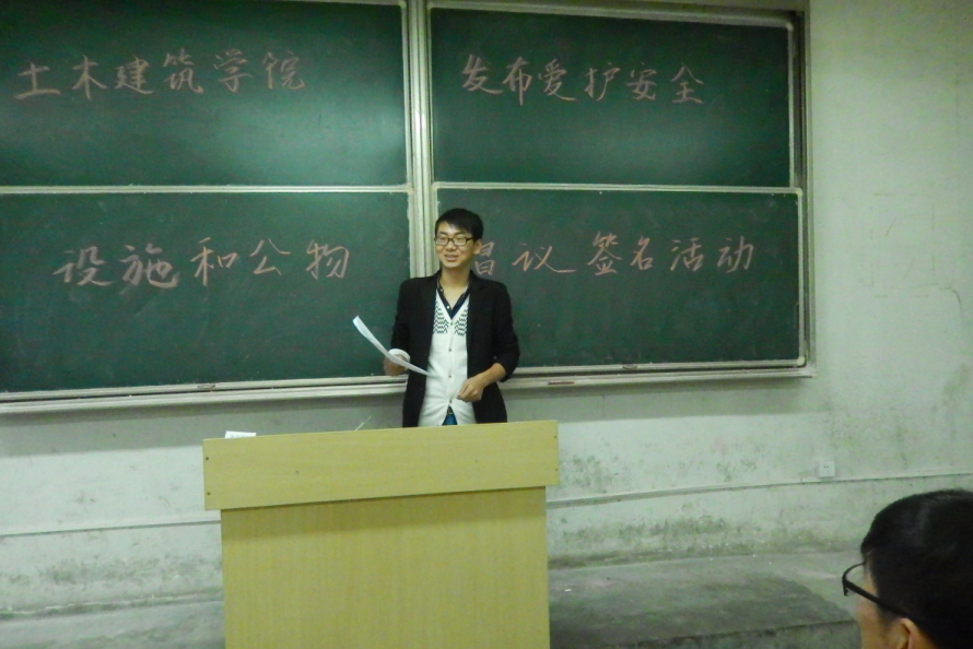 为进一步增强学生爱护公物、保护环境、美化校园意识,土木建筑学院2012级50多名学生代表于12月11日下午在校本部举办了“爱护安全设施和公物”主题讨论班会暨签名活动。