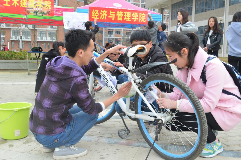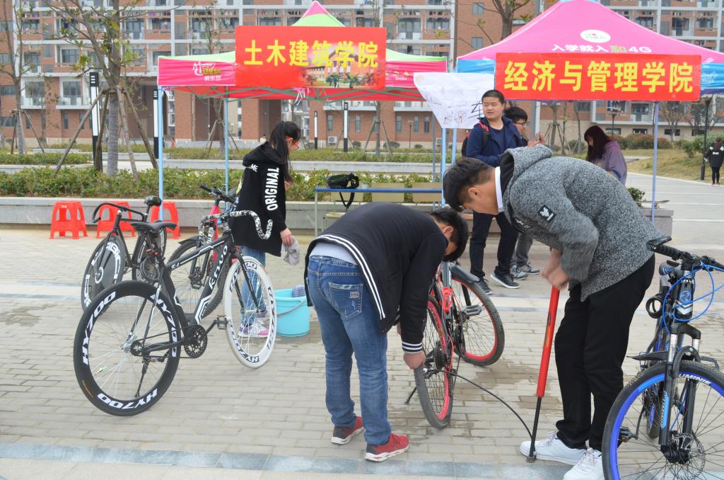 3月17日,土木建筑学院学生会和经管学院学生会联合开展免费为全校学生洗车、擦车、修车的学雷锋志愿服务活动。17日下午14:20至17:50,志愿者们在爱苑食堂门口设置服务点,为近三十位同学免费擦洗了自行车及电动车。