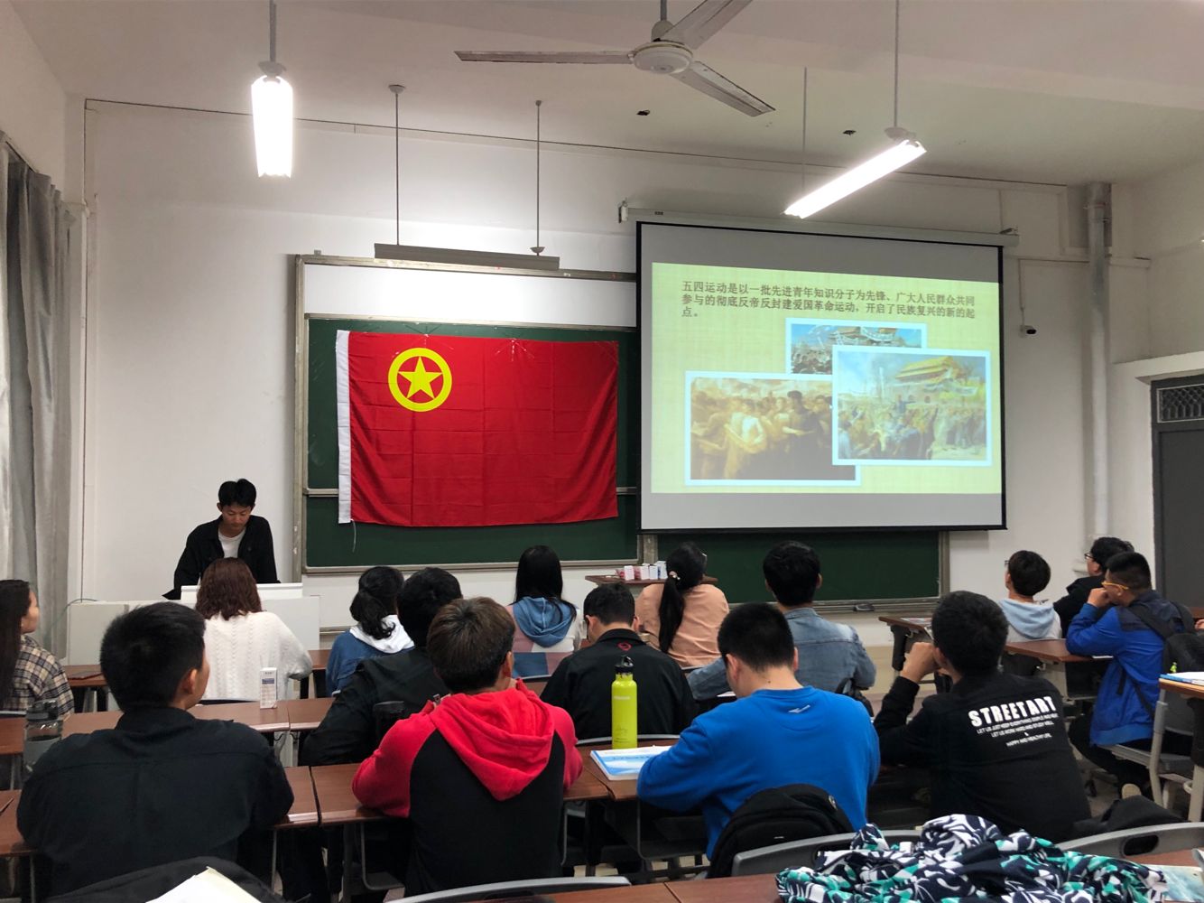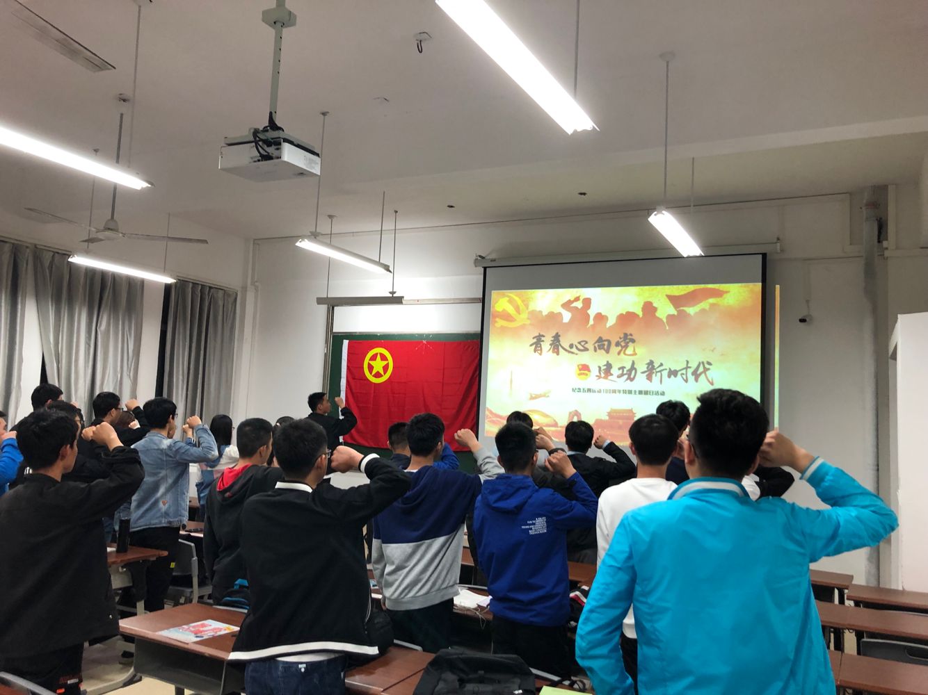 活动在全体同学庄严肃穆的国歌声中拉开帷幕,班级团支部书记王磊介绍了本次活动的目的,通过本次活动让每一位同学深刻认识到自己是一名共青团员,我们要继承、弘扬五四精神,发挥团员的先进性,不忘初心,矢志前行。活动中王磊带领大家回顾了团的发展历史,董大帅做了团旗下的演讲,宣传委员徐迪淇带领大家重温了入团宣誓。活动在全体同学高昂嘹亮的团歌声中落下帷幕。