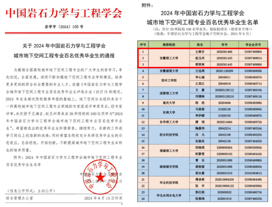 近日,为表彰全国高校地下空间工程专业优秀专业人才,激励广大地下空间工程专业大学生刻苦钻研,争先创优,中国岩石力学与工程学会发布了《关于2024年中国岩石力学与工程学会城市地下空间工程专业百名优秀毕业生的通报》。其中,我院王湘吉、赵玉州、郭贺林三位同学被授予“2024年中国岩石力学与工程学会城市地下空间工程专业优秀毕业生”荣誉称号。