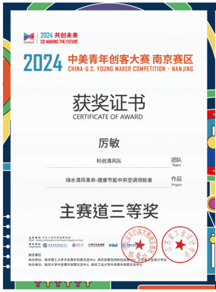 本次中美青年创客大赛由教育部主办,中国(教育部)留学服务中心、清华大学、北京歌华文化发展集团有限公司、英特尔公司和中国大学科技园联盟共同承办。大赛通过层层筛选,共有20个参赛项目入围南京赛区决赛。经现场展示汇报及答辩,由胡时老师指导的团队项目“绿水清风革命——健康节能中央空调领航者”在本次比赛中斩获主赛道三等奖。该项目不仅展现了土木建筑领域的最新科技成果,还体现了团队成员在创新思维和实践能力上的卓越表现。