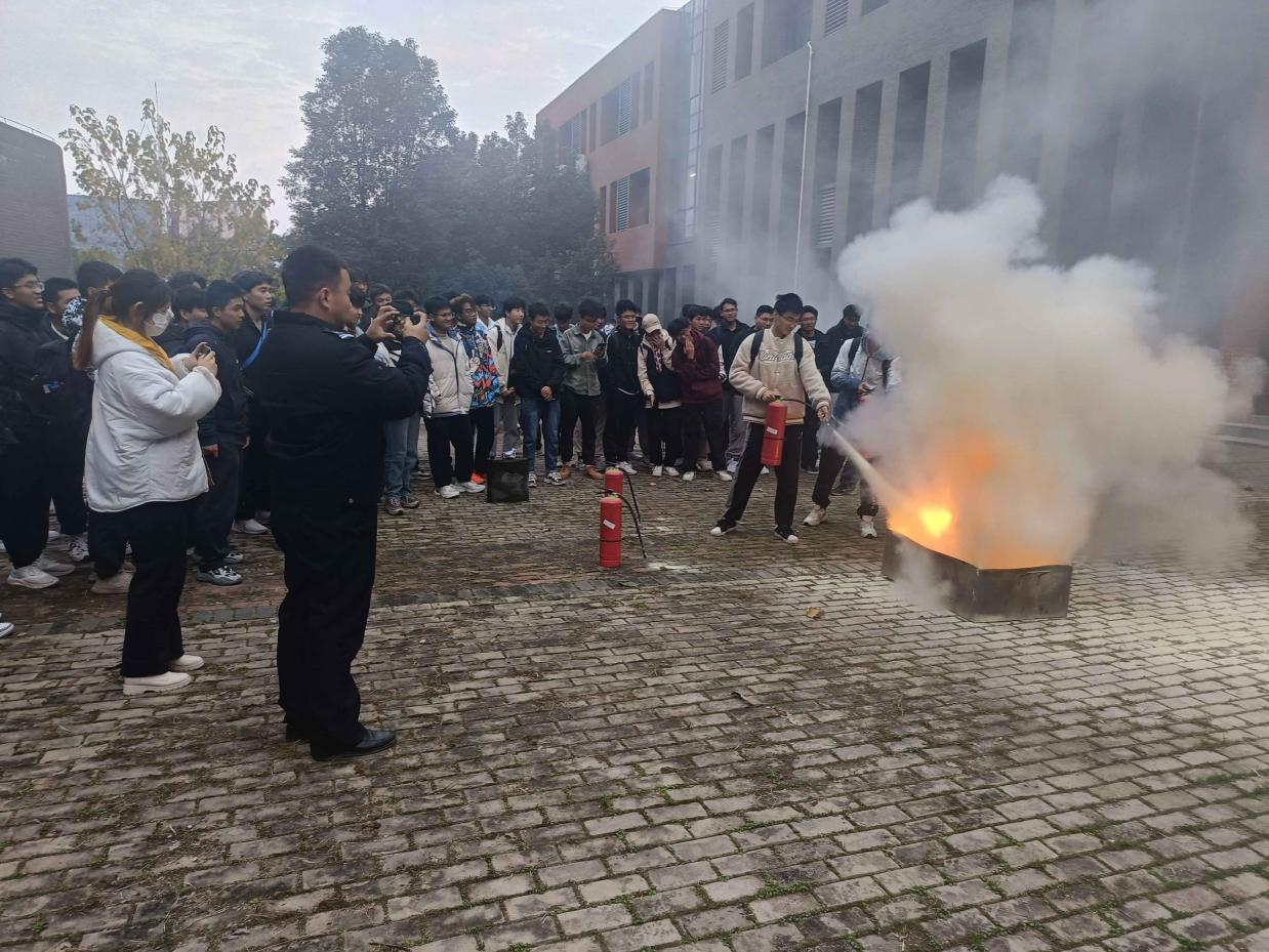 讲座结束后,学院组织参会师生开展了疏散演练,并在户外就常用灭火器的正确使用进行了实际操作培训。实操现场模拟起火点,“一站式”学生社区消防志愿者分批亲身体验,扑灭火槽明火。