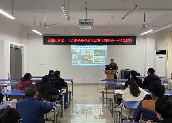 报告会中,贾可首先与师生共同追忆了自己在母校学习、生活期间的难忘回忆,以及自己在学习、工作、科学研究等方面的经验与收获。随后,贾可从铁路枢纽总图规划特点、合肥枢纽现状及周边铁路网情况、合肥枢纽总图规划情况、淮南铁路规划与建议等四个方面对合肥(及淮南)铁路枢纽规划进行了展望并提出了合理化建议。近两个小时的学术报告,理论性强、内容丰富、图文并茂,参会师生表示获益匪浅。