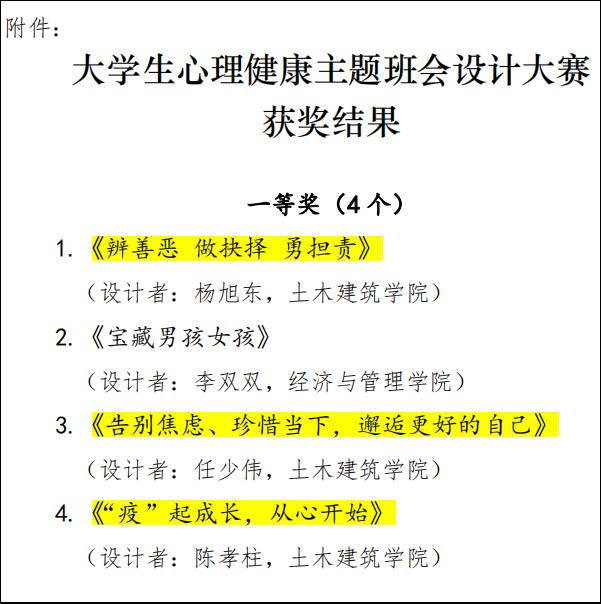 近日,“淮南地区高校心理健康教育联盟”大学生心理健康主题班会设计大赛评选结果揭晓,一等奖共有四项,我院斩获三项,为学院争得了荣誉。