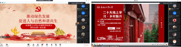 上半场中,安徽理工大学土木建筑学院硕士研究生第一党支部代表臧龙同志以“推动绿色发展,促进人与自然和谐共生”主题为,他以习近平生态文明思想的世界观和方法论为基础,科普了当今大农业观下生产对环境的影响,阐述了近十年绿色建筑行业的发展及对未来的展望,并号召土木学子为建设人与自然和谐共生的现代化而努力奋斗。合肥工业大学建筑与艺术学院研究生第二党支部代表王峪琳同志分享的主题为“乡村振兴”,他带领大家学习了党的二十大报告中关于“全面推进乡村振兴”的新论点与新要求。王峪琳同志认为,全面建成小康社会之后,我国要向实现共同富裕的远景目标而奋斗,乡村振兴将是全体人民实现共同富裕的必然要求。