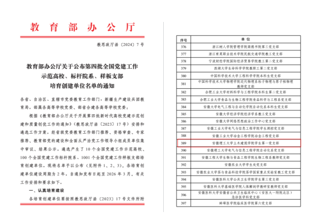 近日,《教育部办公厅关于公布第四批全国党建工作示范高校、标杆院系、样板支部培育创建单位名单的通知》(教思政厅函〔2024〕7号)正式发布,我院学生第一党支部入选第四批“全国党建工作样板支部”培育创建单位名单,是此次全校唯一入选的学生党支部。