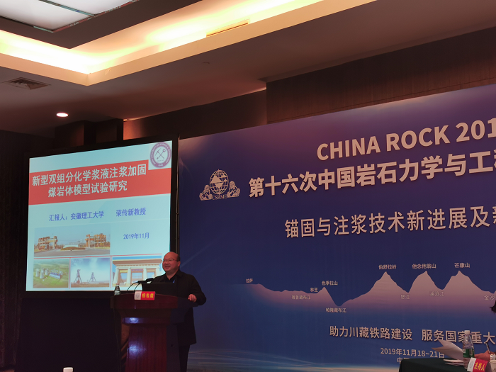会上,荣传新教授被选为“锚固与注浆分会”副理事长,并在锚固与注浆分会场以“新型双组分化学浆液注浆加固煤岩体模型试验研究”为题作学术报告,受到与会专家学者关注。