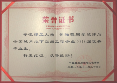 我校土木建筑学院城市地下空间工程专业2012级黄强强同学被中国岩石力学与工程学会评为“全国城市地下空间工程专业2016届优秀毕业生”。